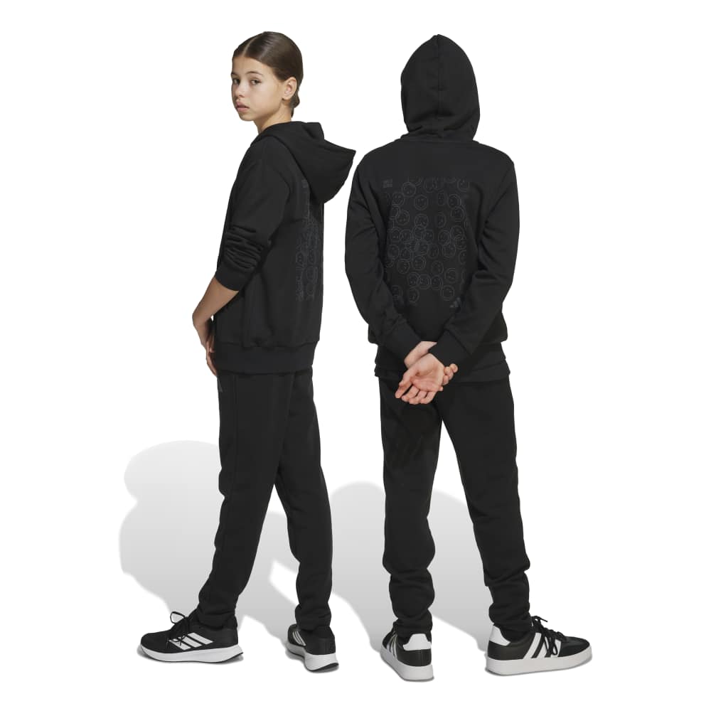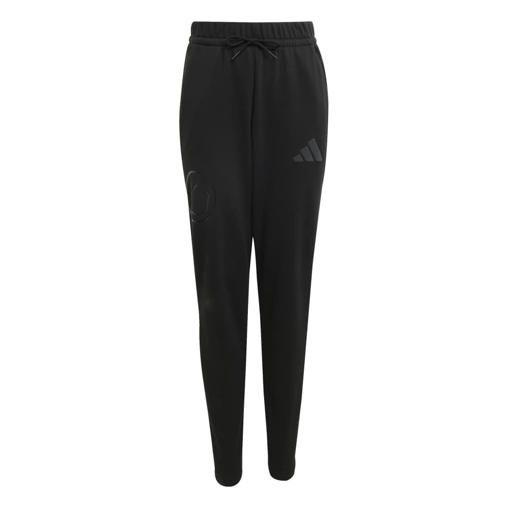 • Brighten up your junior's wardrobe with the adidas x SmileyWorld pants, a delightful collaboration designed to spread happiness. These regular fit pants, made from a blend of cotton, recycled polyester, and viscose, feature a unique glossy smiley graphic and a soft suede print 3 bar logo. With a comfortable knit construction and a drawstring closure, these pants are perfect for everyday wear, combining playful design.
