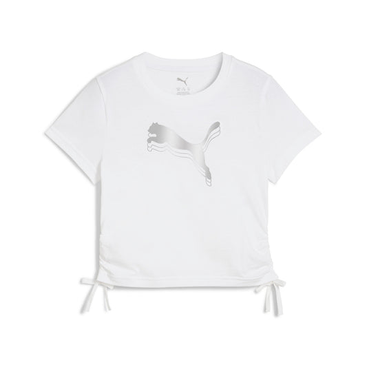 PRODUCT STORY Shine with PUMA's metallic knotted tee. Featuring a silver PUMA Cat Llogo print,...