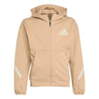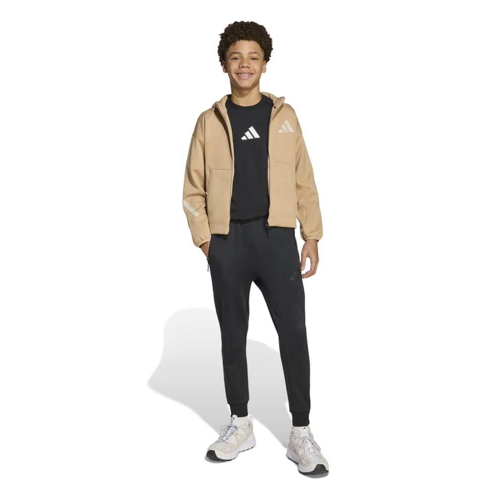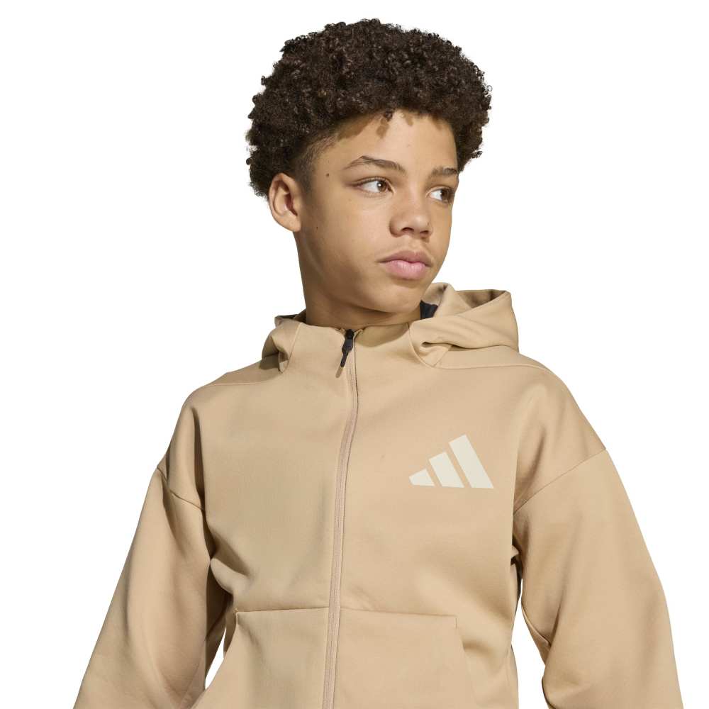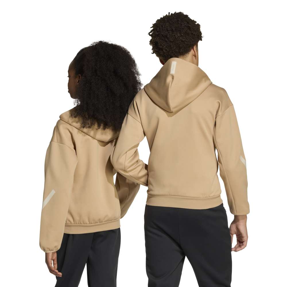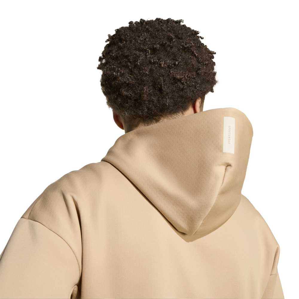 • Introducing the Z.N.E. Full Zip Hoodie, a unisex piece that transcends sports. Made with a sustainable blend of 57% recycled Polyethylene Terephthalate and 43% Better Cotton, this regular fit hooded track top is a testament to adidas' commitment to the environment. The 330g doubleknit spacer fabric, constructed with three layers, blocks out the cold while the matte rubber print three-bar logo adds a touch of style. Tech-inspired drawcords and zippers complete the look, making this hoodie a perfect companion for those seeking connection and community through sport.