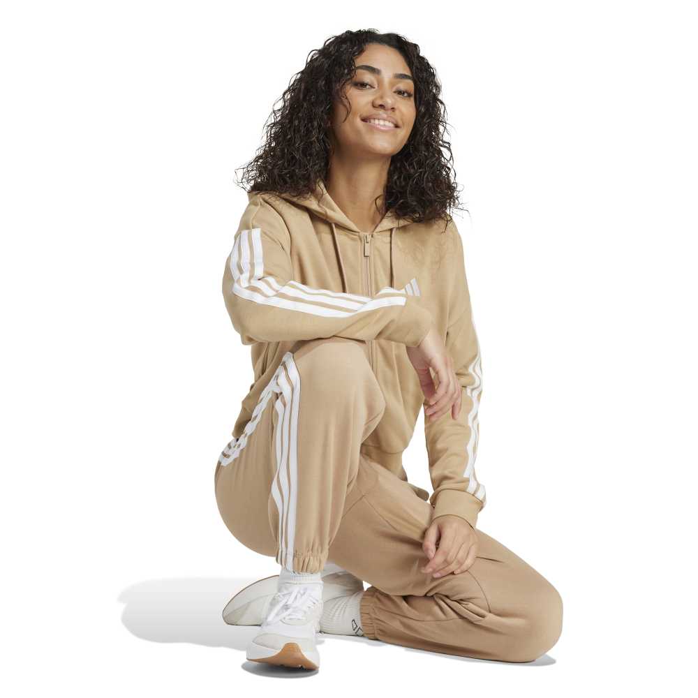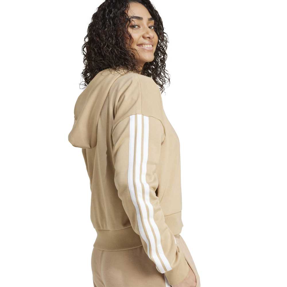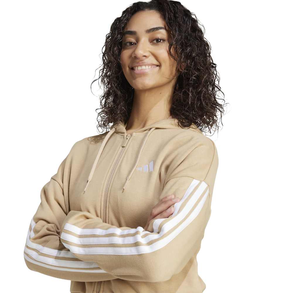 - Introducing the Essentials 3-Stripes French Terry Full Zip Hoodie for women. This regular fit, hooded track top is made with a blend of Better Cotton, recycled Polyethylene Terephthalate, and Viscose. It's a nod to adidas' commitment to end plastic waste, with a sustainable design that supports sustainable cotton farming. The traditional three stripes branding and modern fit make it a versatile addition to any wardrobe, easily paired with your favourite fashion items.