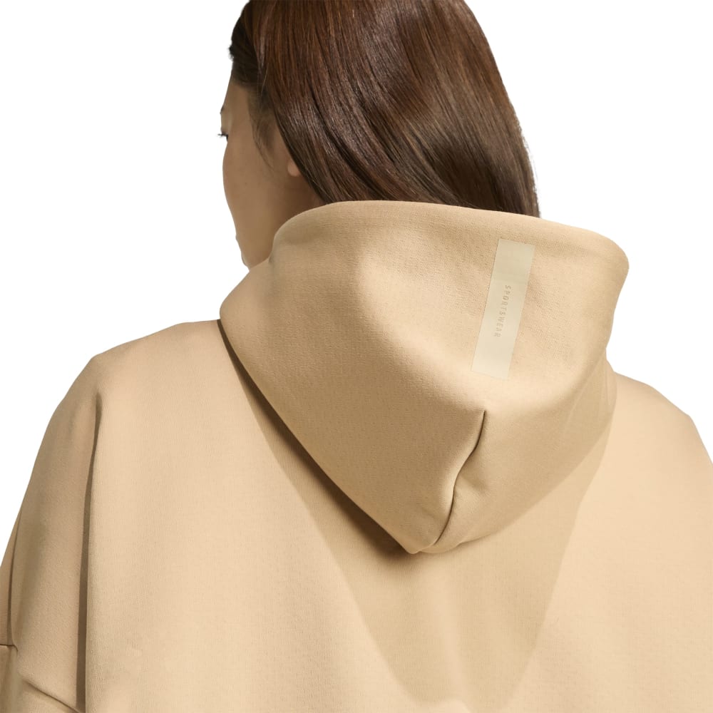 - Embrace the feeling of belonging and community with this adidas Z.N.E. full-zip hoodie designed for women. The loose-fit track top is knit from a sustainable blend of 57% recycled polyester and 43% cotton, designed for maximum warmth and dryness with a unique three-layer doubleknit spacer fabric. Featuring matte rubber prints inspired by iconic field lines, tech-inspired drawcords and zippers, it offers an effortless mix of style, comfort and positive vibes.