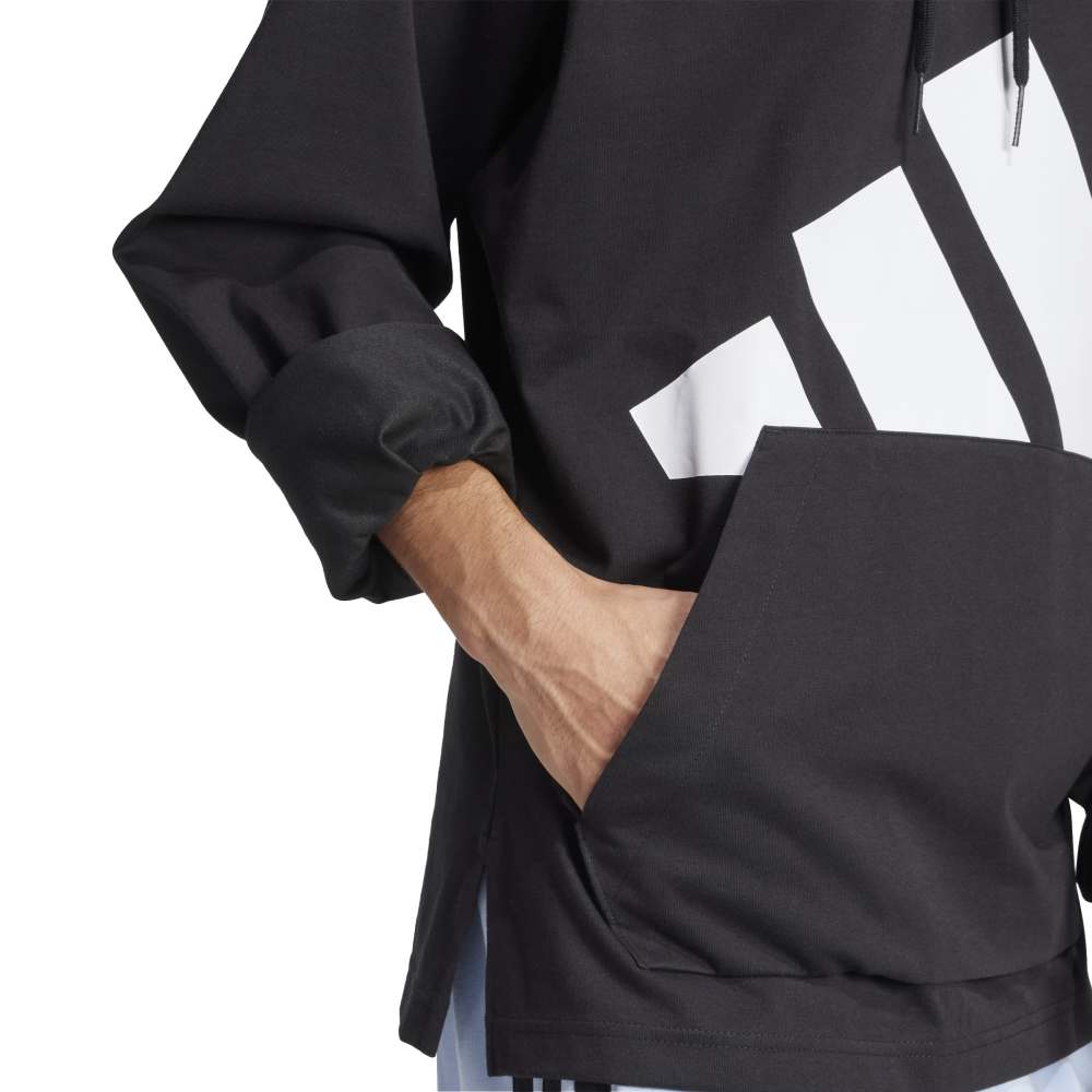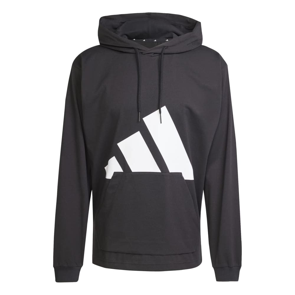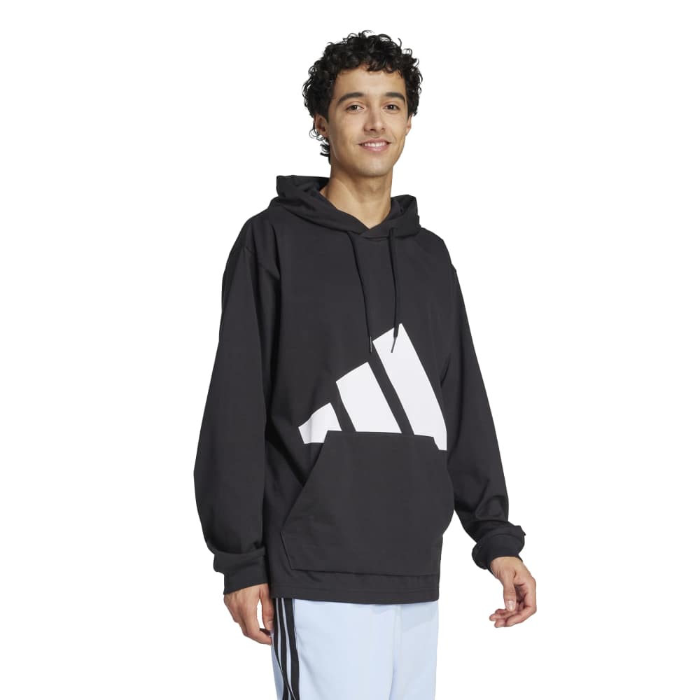 - Introducing the Essentials Big Logo Single Jersey Hoodie for men. Crafted with a blend of Better Cotton and recycled Polyethylene Terephthalate, this regular fit hooded sweatshirt is made with recycled and renewable materials. It features a modern design with an updated fit, dropped shoulder and armhole, slightly shortened back length, and a new 2-piece hood construction. The rubber printed 35cm three-bar logo adds a distinct adidas touch. Ideal for an easy, everyday look.