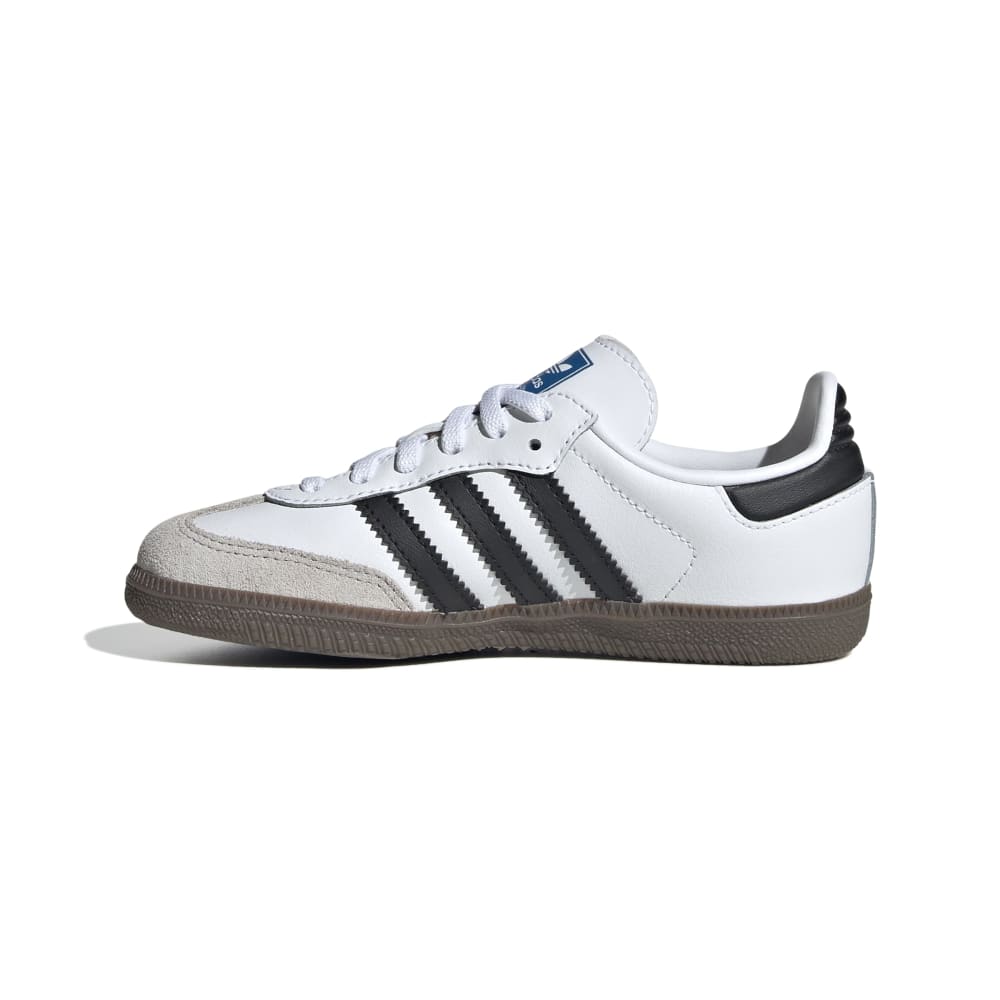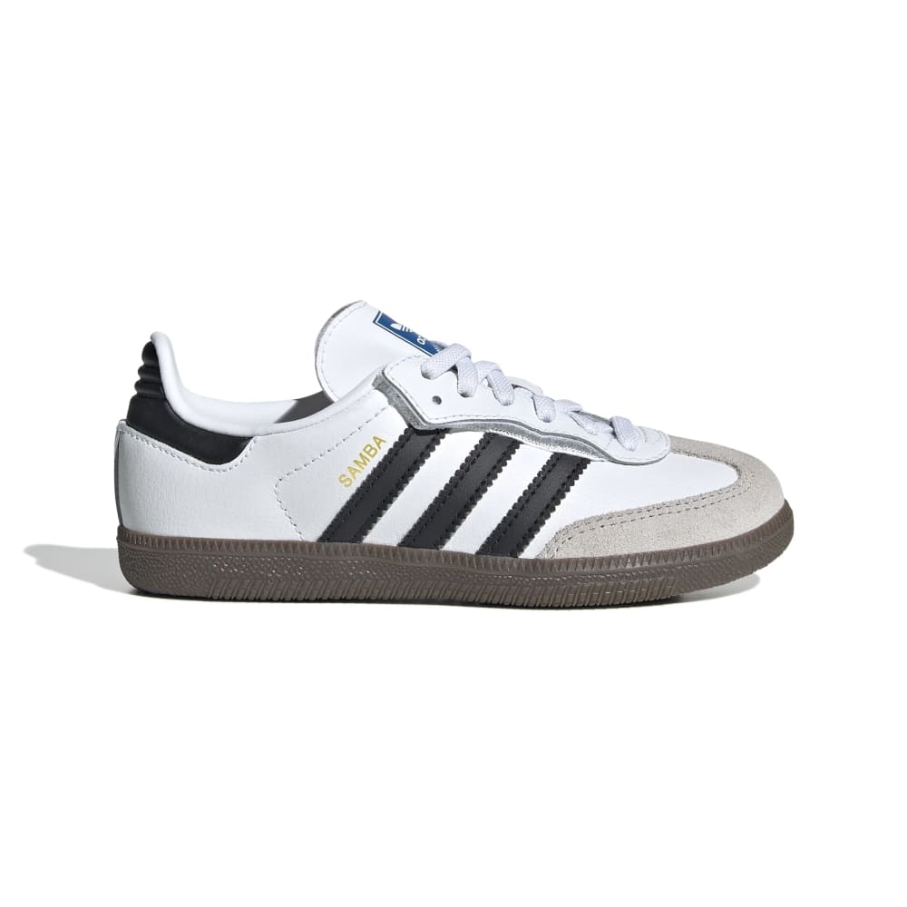 • A legend in their own right, the adidas Samba shoes have kicked their way through the decades since the '50s, from football pitches to playgrounds, collecting fans with every step. The smooth leather upper pairs with a grippy rubber outsole to keep kids comfortable and moving with ease. An OrthoLite® sockliner adds comfort for all-day adventures. Elastic laces make them easy to slip on and off so nothing comes between kids and their play.