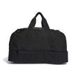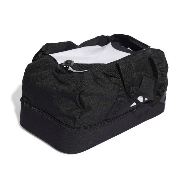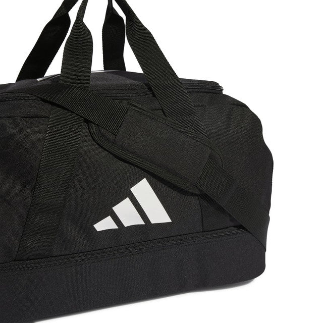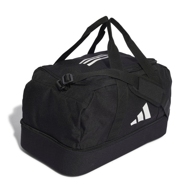 - Perfect For Storing Your Football Gear, This Adidas Tiro League Duffel Bag Includes A Hard-Case Bottom Compartment For Added Durability And A Side Mesh Pocket To Keep Snacks And A Water Bottle Within Reach. The Padded, Adjustable Shoulder Strap Ensures Every Carry Is A Comfortable One. The Handles Make It Easy To Grab When You'Re In A Hurry To Get To Training.