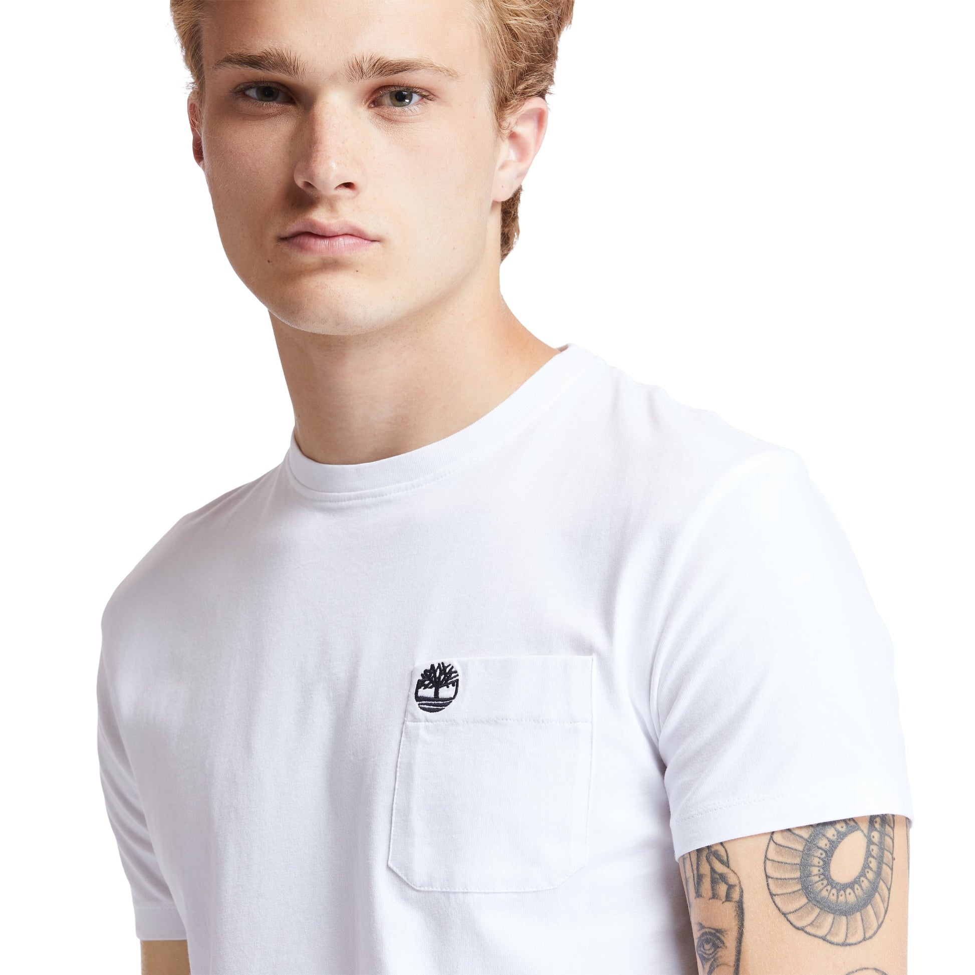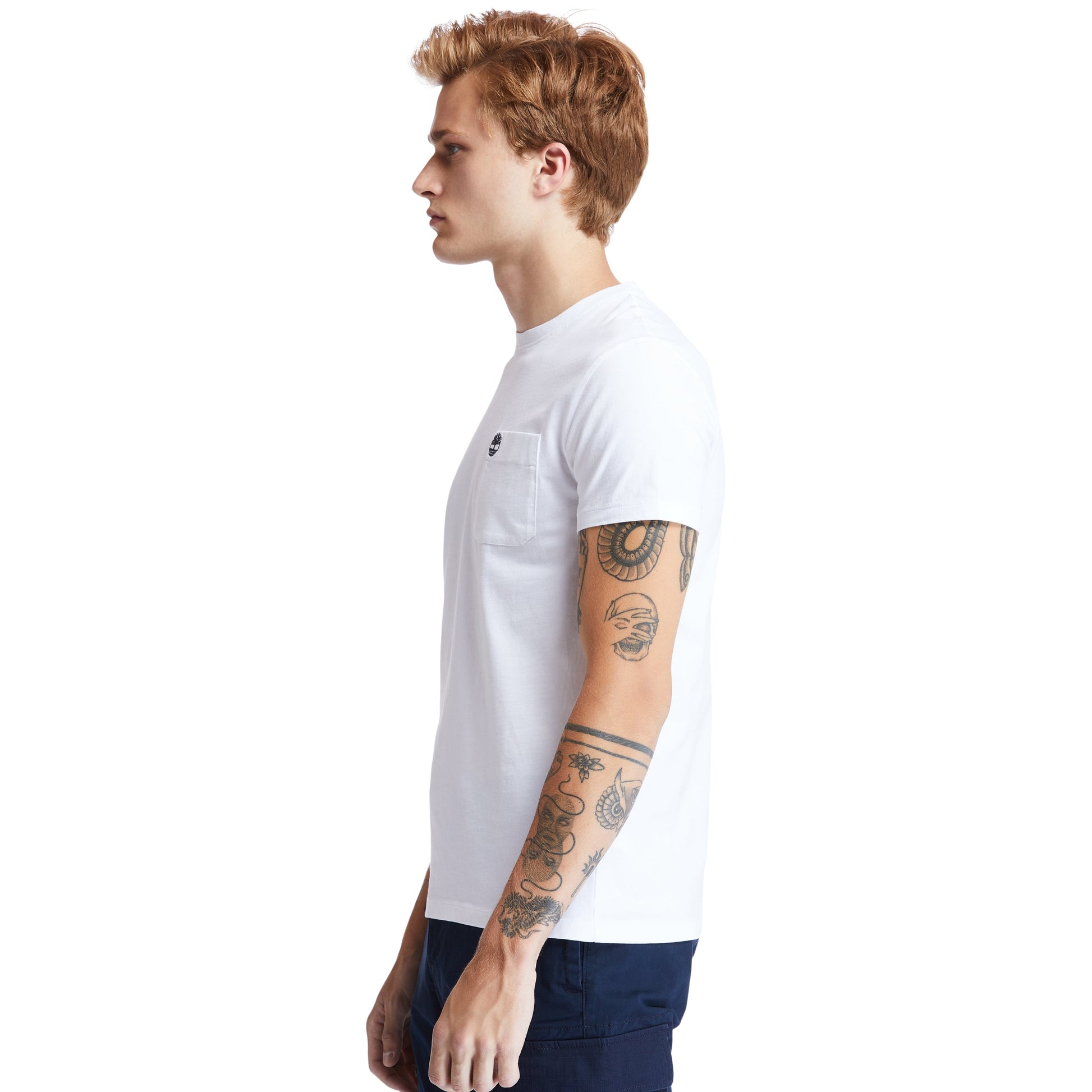 GENDER: MEN This slim men’s T-shirt is made with 100% organic cotton, which is grown without harmful chemicals or pesticides. The T-shirt has short sleeves, a classic crew neck, and it features an embroidered Timberlandآ® tree logo on the chest.