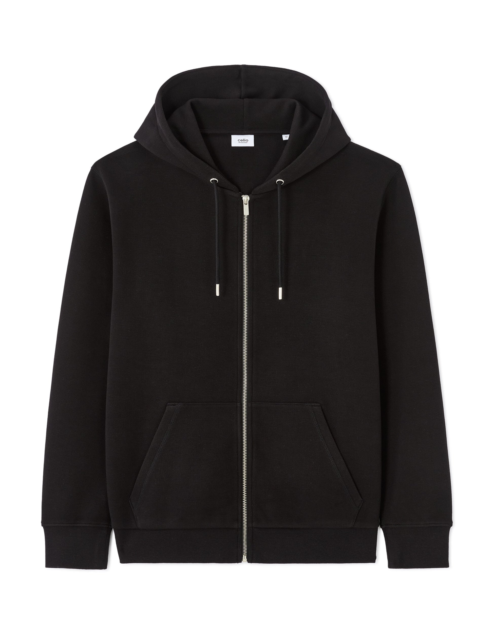 - Assert your style with this men's zip-up jacket.- Black zip-up hoodie- Made of piqué fabric- Soft touch- Zip-up- Kangaroo pocket- Hooded- Perfect with trousers or shorts.