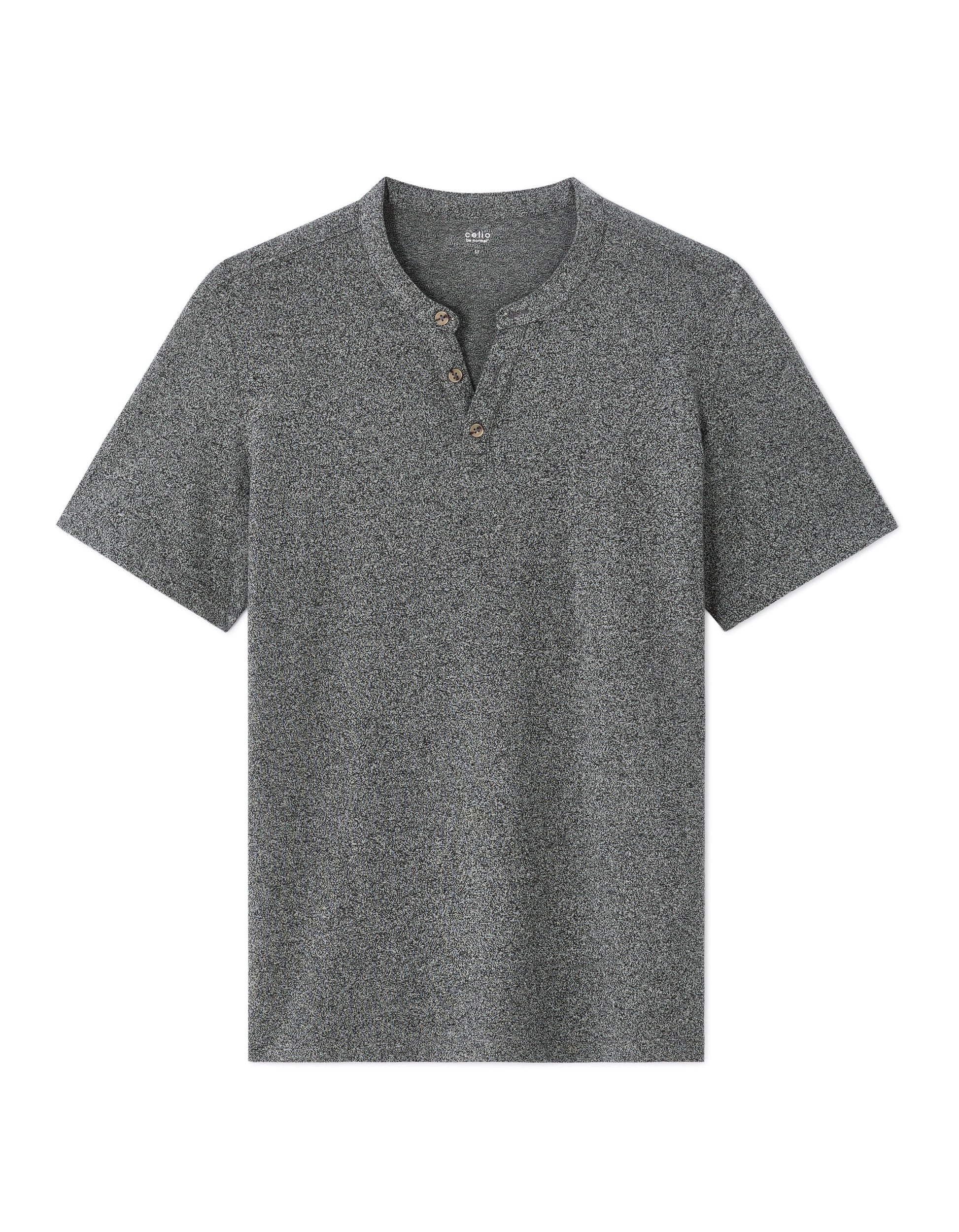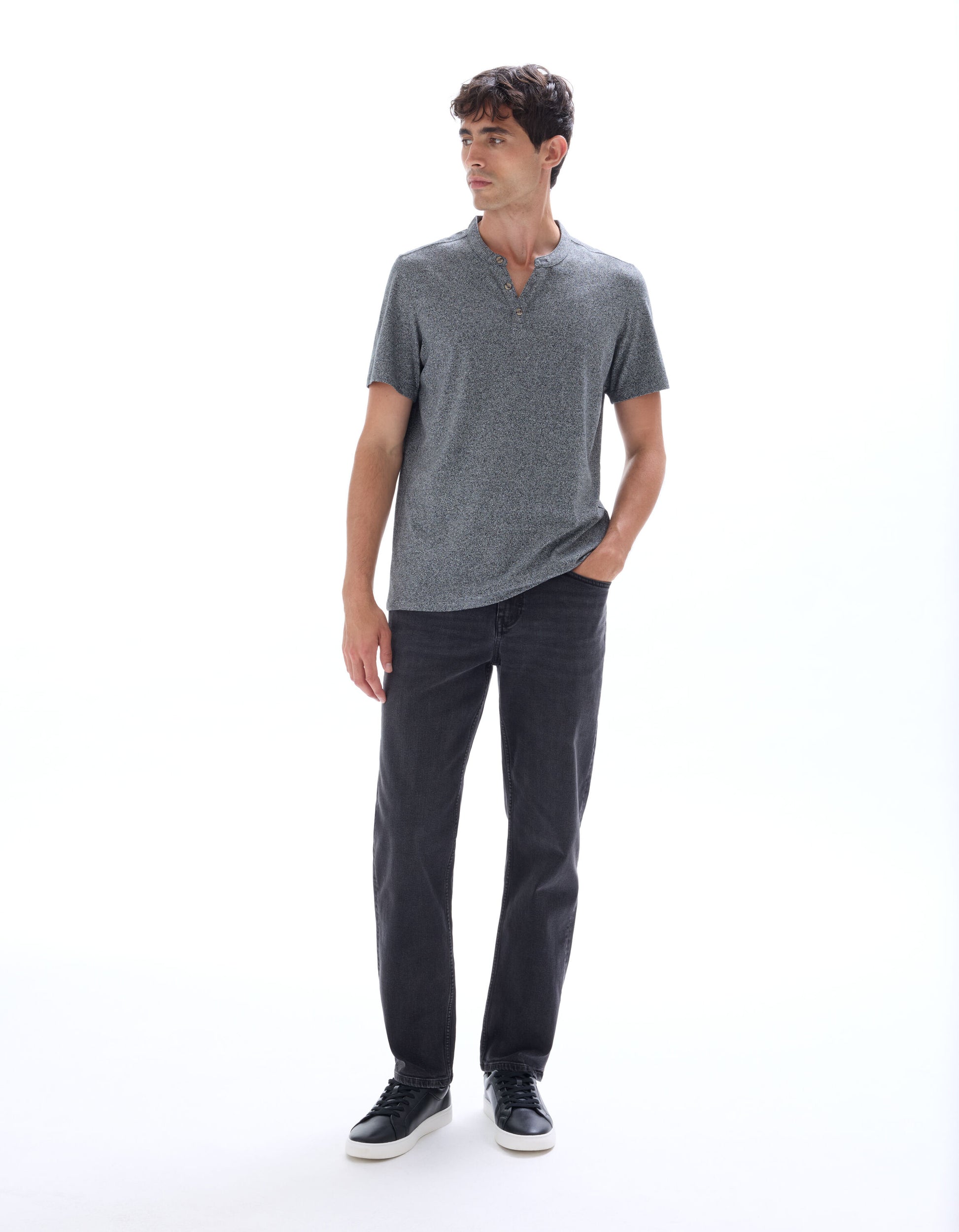 - Adopt a casual chic style with this men's t-shirt, perfect for any occasion! - Black short-sleeved t-shirt- Regular fit- Mixed cotton jersey- Short sleeves- Tunisian collar- Soft touch- Heathered fabric- Wear it with comfortable chinos and trendy sneakers for a complete look.