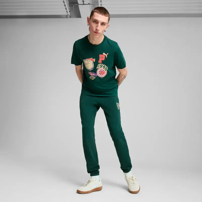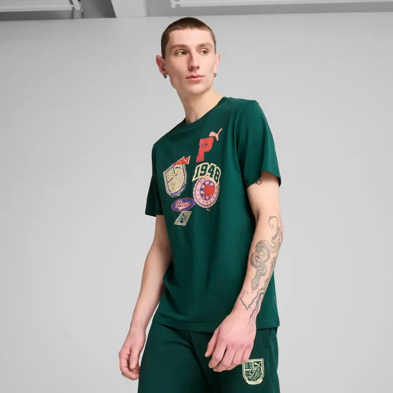 Unleash your sporty side with this PUMA tee featuring a bold graphic print on the chest. Perfect for any casual outfit, this top brings energy and style to your wardrobe. Make a statement and embrace your legacy with PUMA.