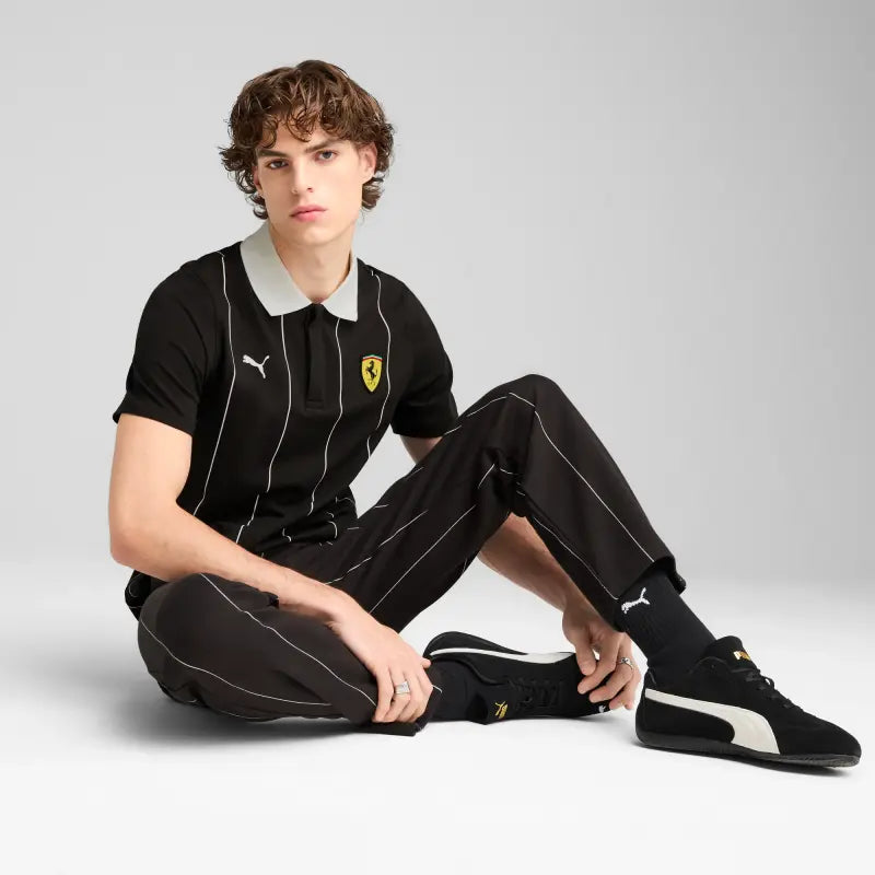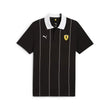 Unleash your inner racer with this PUMA polo featuring a white rib collar, printed pinstripe fabric, and tonal double stitching. Show off the iconic PUMA Cat logo and Scuderia Ferrari shield, blending tradition and innovation for a sophisticated, energetic look.