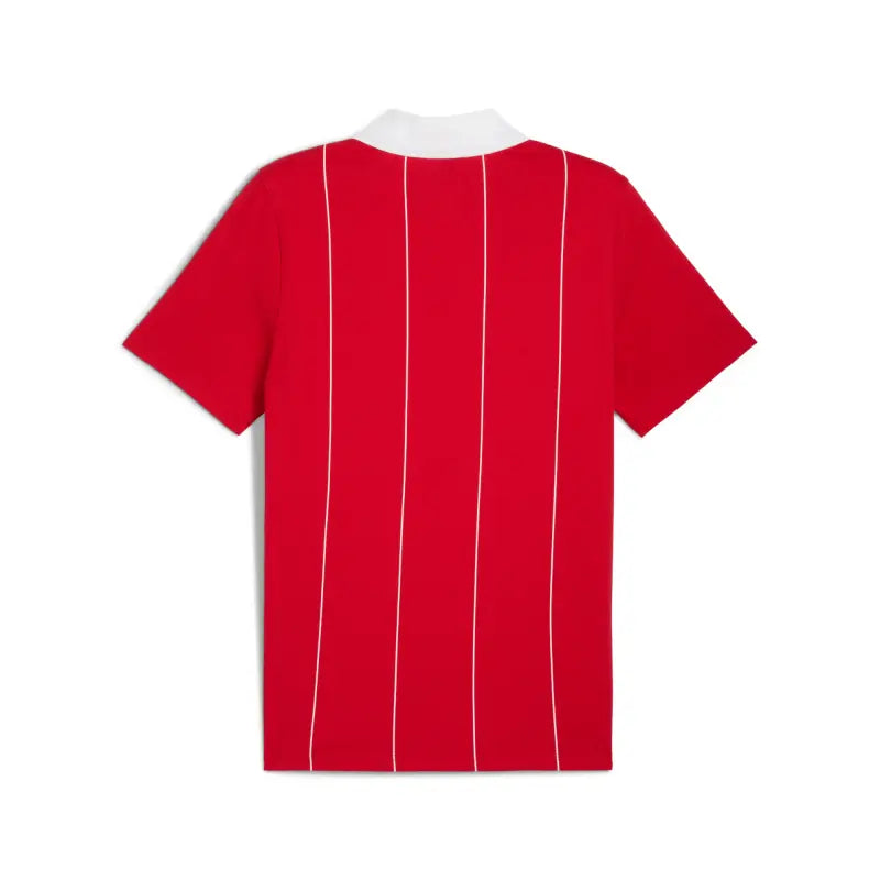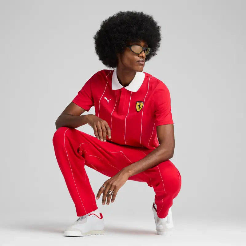 Unleash your inner racer with this PUMA polo featuring a white rib collar, printed pinstripe fabric, and tonal double stitching. Show off the iconic PUMA Cat logo and Scuderia Ferrari shield, blending tradition and innovation for a sophisticated, energetic look.
