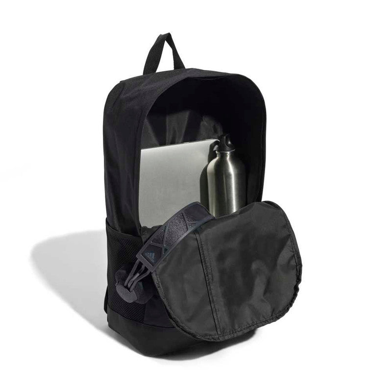 - No matter where the day takes you, this adidas backpack keeps your essentials organised and close at hand. Padded straps ensure carrying comfort. Slip-in pockets have room for a water bottle and compact umbrella, while a front zip pocket provides quick access to your keys and phone.