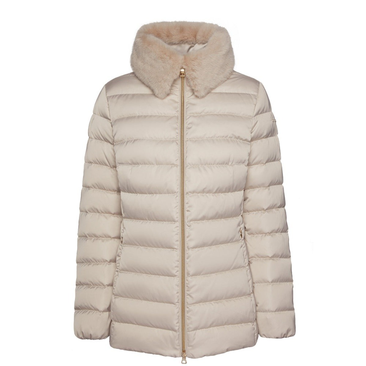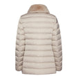 - Women's beige jacket, waterproof and windproof in a regular fit by GEOX. Made with Geox's exclusive patented breathable tape, it provides maximum comfort, natural thermoregulation and breathability. Exterior made of 100% windproof and water-repellent polyester with Amphibiox™ technology that guarantees protection even in torrential rain . Internal filling with EcologicWARM padding, recycled synthetic down, a material with sustainable performance that testifies to Geox's friendly and sustainable approach to environmental protection. Closes with a two-way zipper. It has two external zippered pockets , one internal pocket and a removable eco - fur collar.