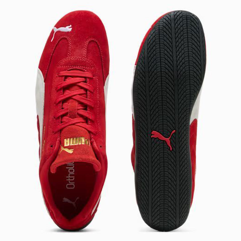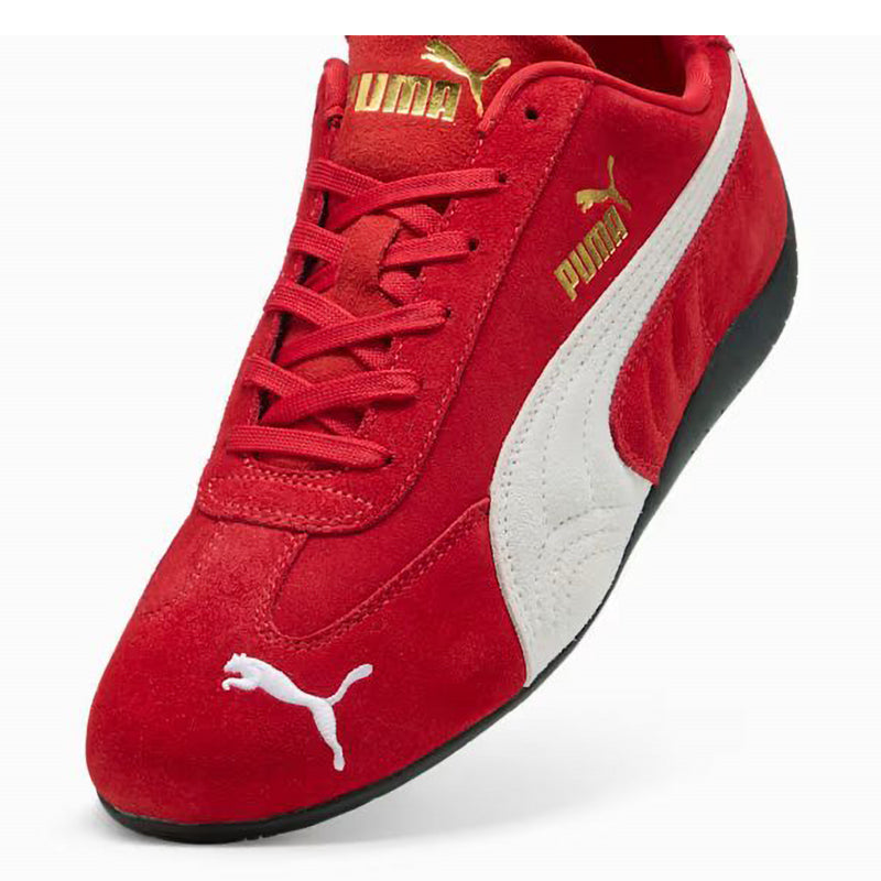 • An icon of racing culture, the PUMA Speedcat has been synonymous with speed, precision, and unparalleled performance for over 25 years. It originated as a fireproof Formula 1® footwear style, but over the decades it found itself on a new circuit – transcending the tracks of Monaco for the streets of global fashion capitals. Wrapped in soft suede and premium leather, this silhouette is reissued in its original red and black colorways with a new PUMA Cat Logo at the front.
