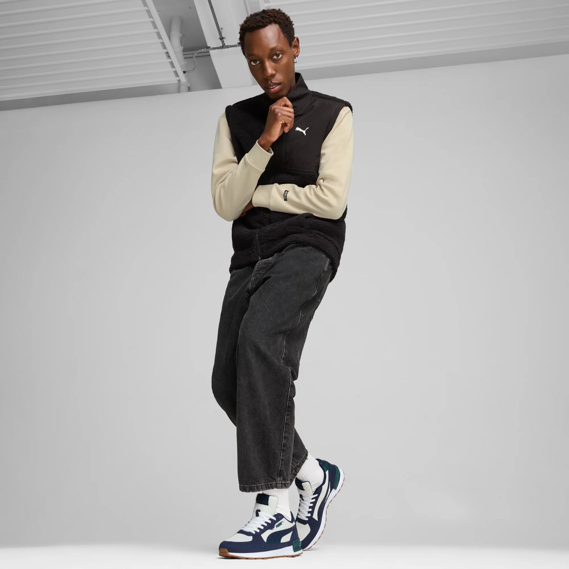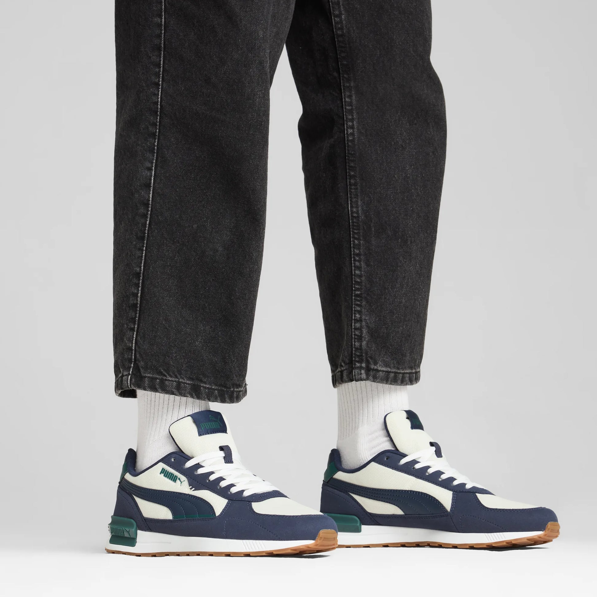 The Graviton is a relaxed shoe with a dynamic form. The construction is inspired by PUMA’s archive running styles and includes a mixed material upper, bold overlay wrapped around the forefoot and sculptural textures on the sidewall. The feeling is definitely future-focused with its modular heel clip, but comfort is prioritised too with the lightweight IMEVA sole and SoftFoam+ sockliner adding bounce to your step.