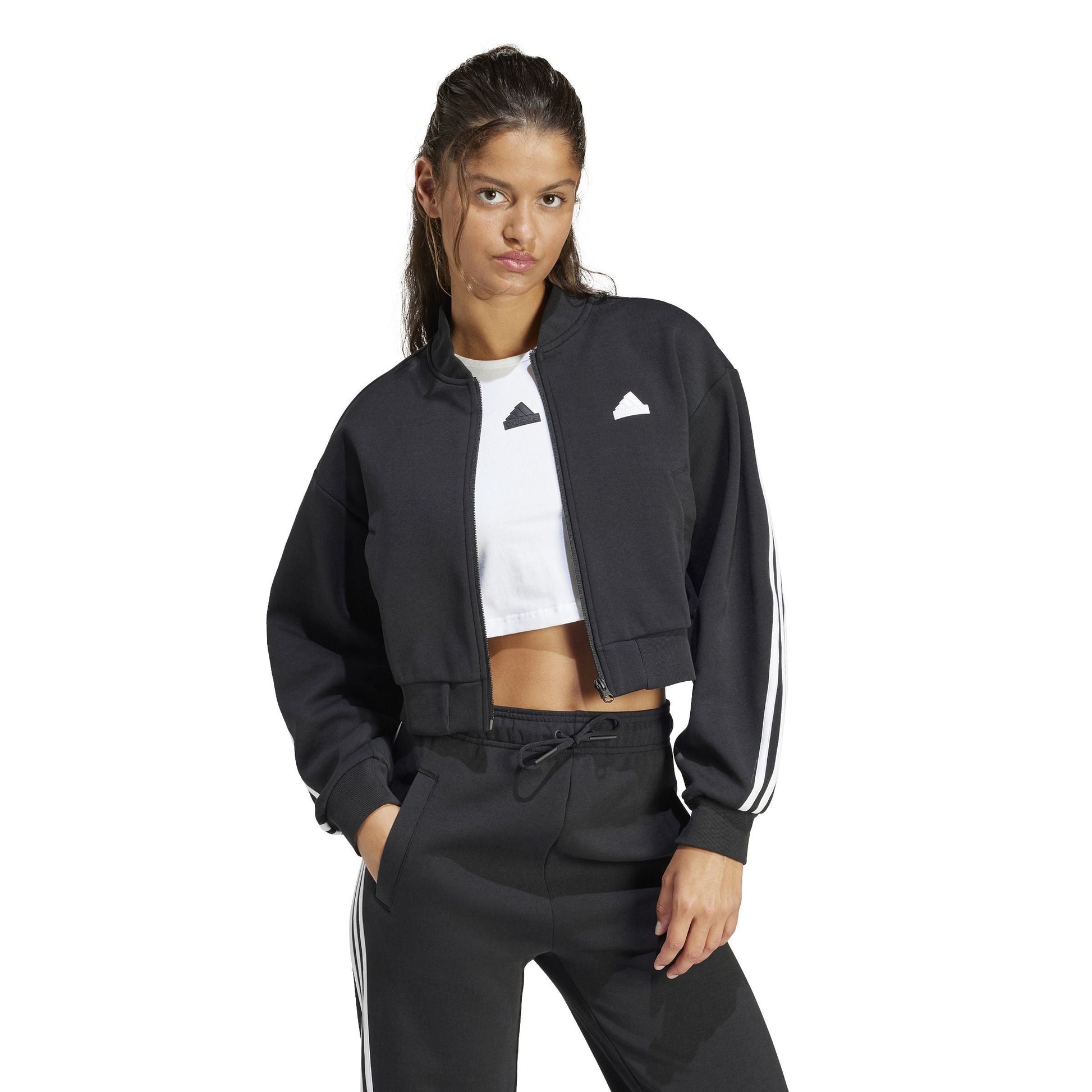 - Embrace the future with the adidas Future Icons Three Strips Bomber for women. This loose-fit track top, crafted in premium woven fabric blends both cotton and recycled polyester, elevating sportswear to new heights of sustainability. With distinctive wrapping three stripes, a ribbed crew collar and heat applied Performance label, it's where timeless design meets modern day comfort.