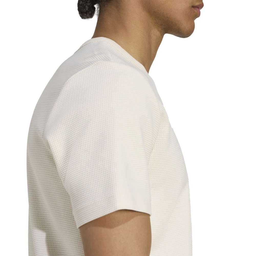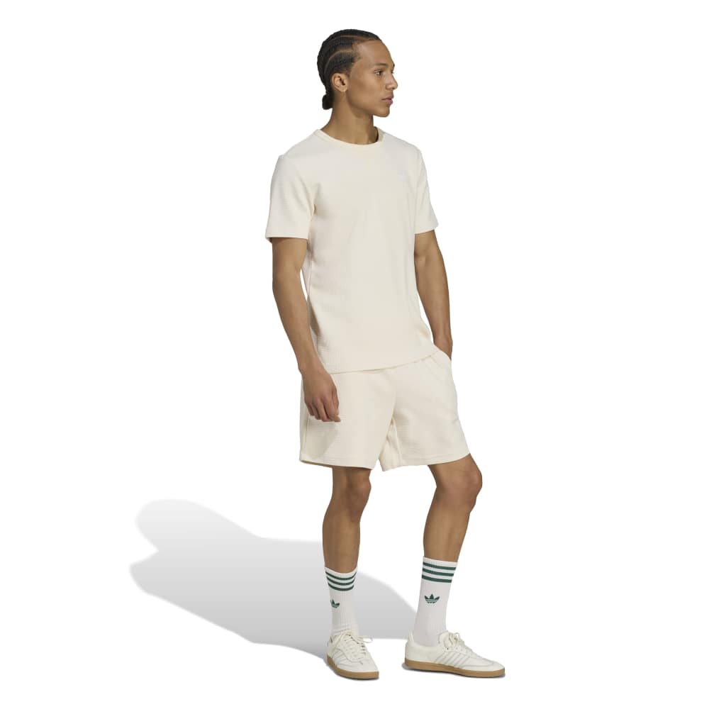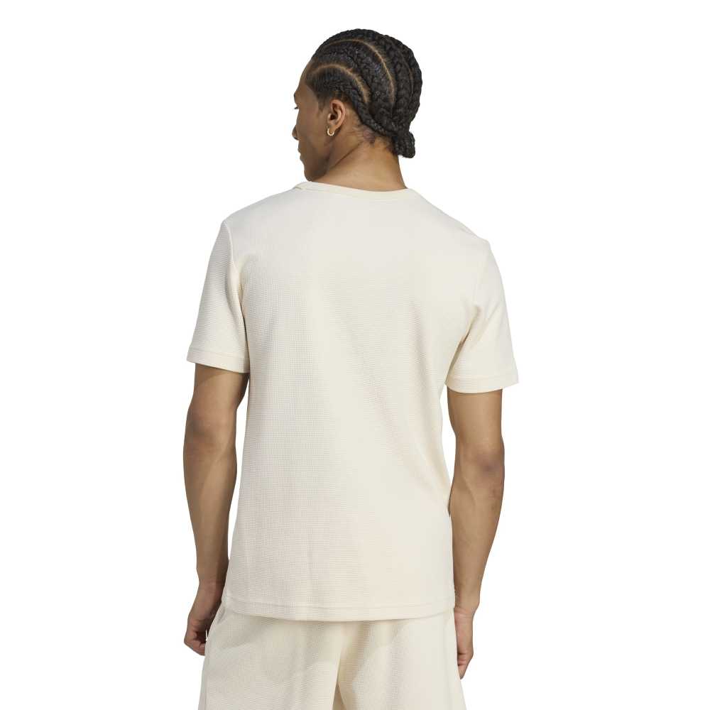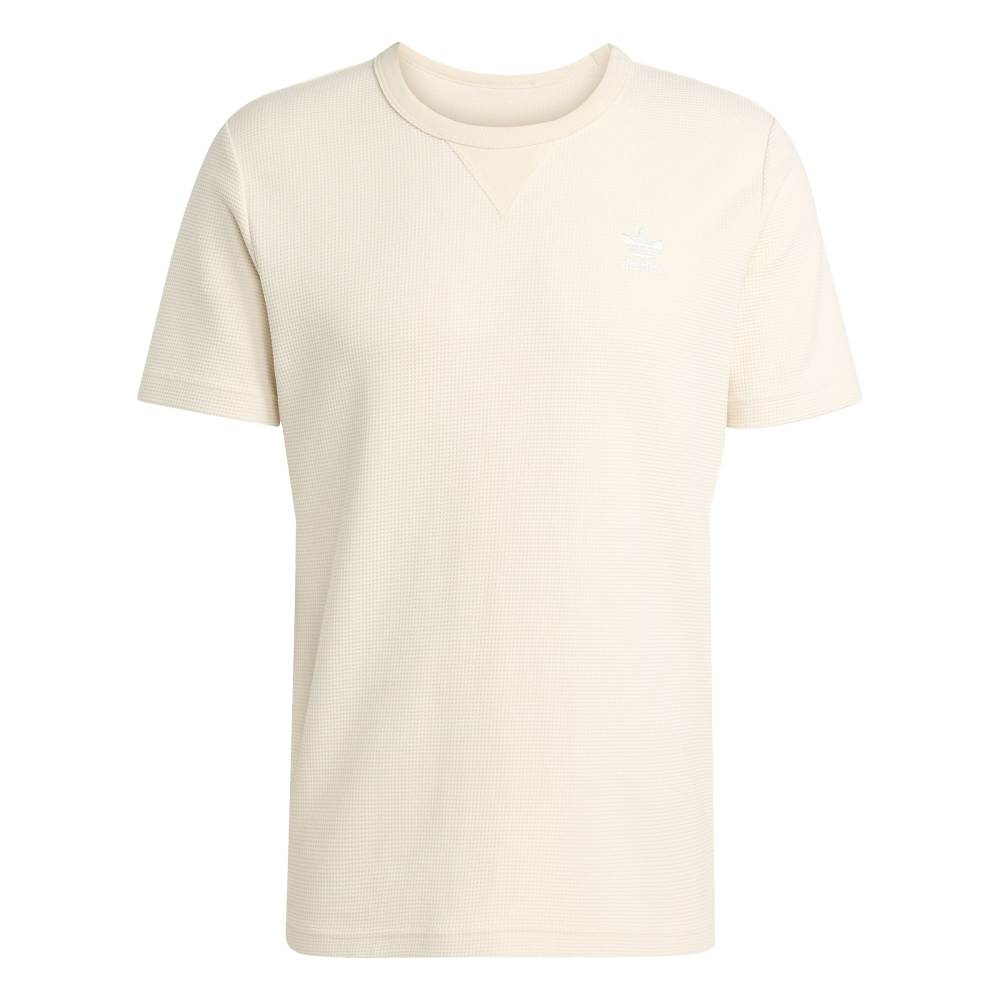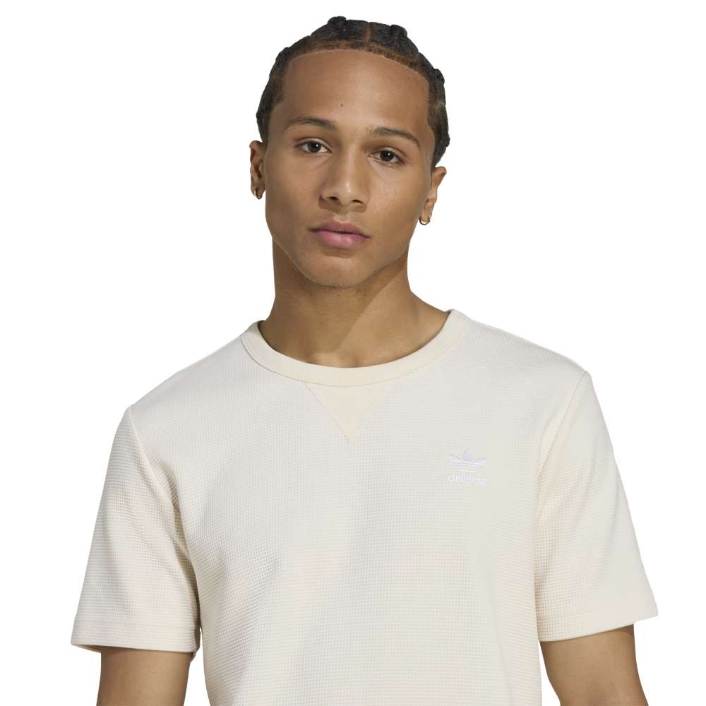 - Introducing the Trefoil Essentials Waffle T-shirt, a man's everyday staple with a keen attention to detail. This regular fit, short-sleeved tee is made with a sustainable blend of 54% recycled Polyethylene Terephthalate and 46% Better Cotton, crafted into a comfortable knit. The left chest features an embroidered stacked Trefoil, adding a touch of adidas heritage to your casual ensemble. This shirt is not just a piece of clothing, it's a commitment to sustainability and style.